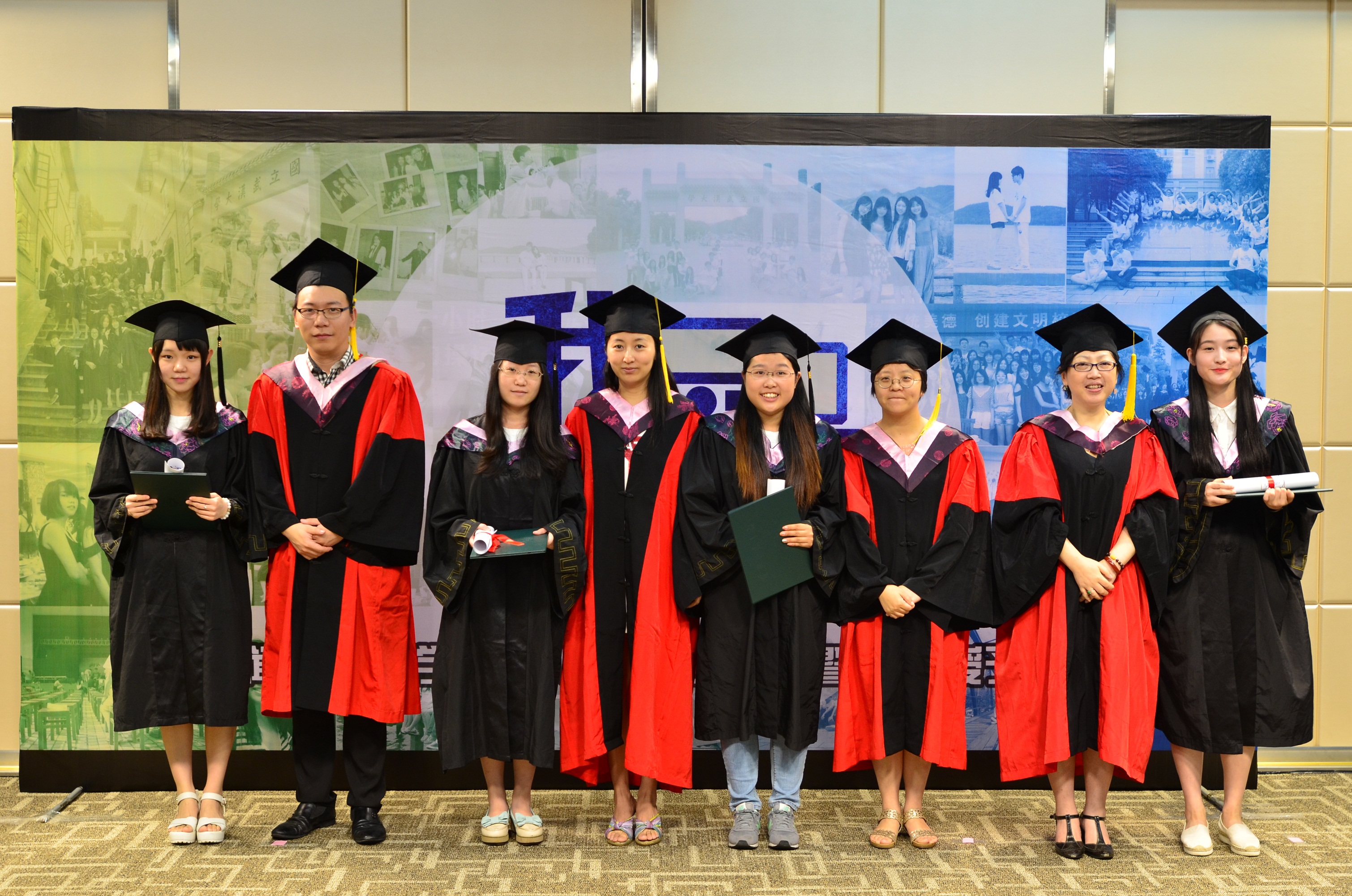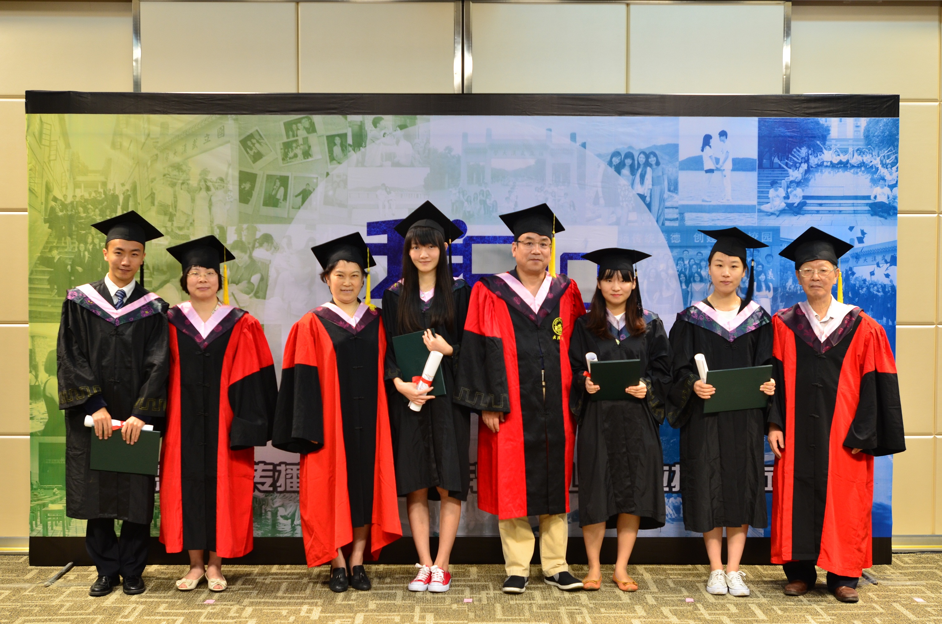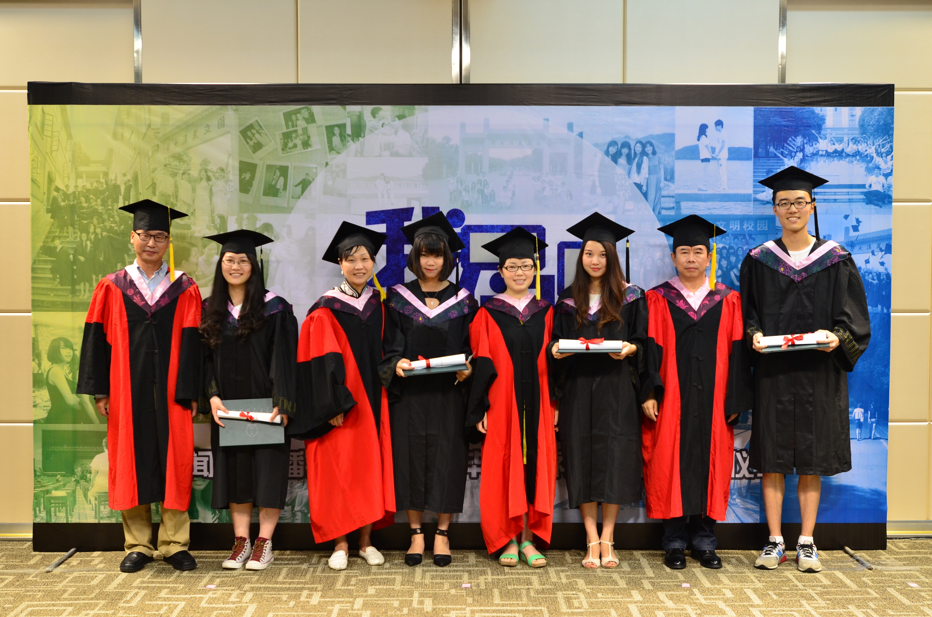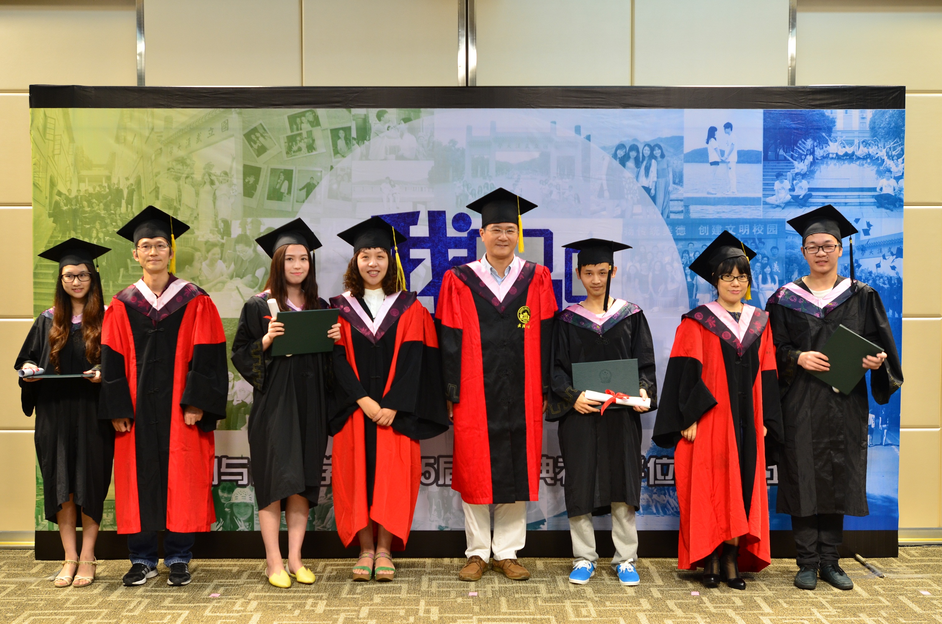 毕业生一组一组走上舞台,与各系导师们鞠躬、握手,导师给每名毕业生拨穗、授予毕业纪念卷轴和绿色的学士学位证书,并合影留念。台上,导师和毕业生的脸上都洋溢着快乐的笑容;台下,完成仪式的毕业生三三两两地合照,整个报告厅充满了喜庆的气氛。