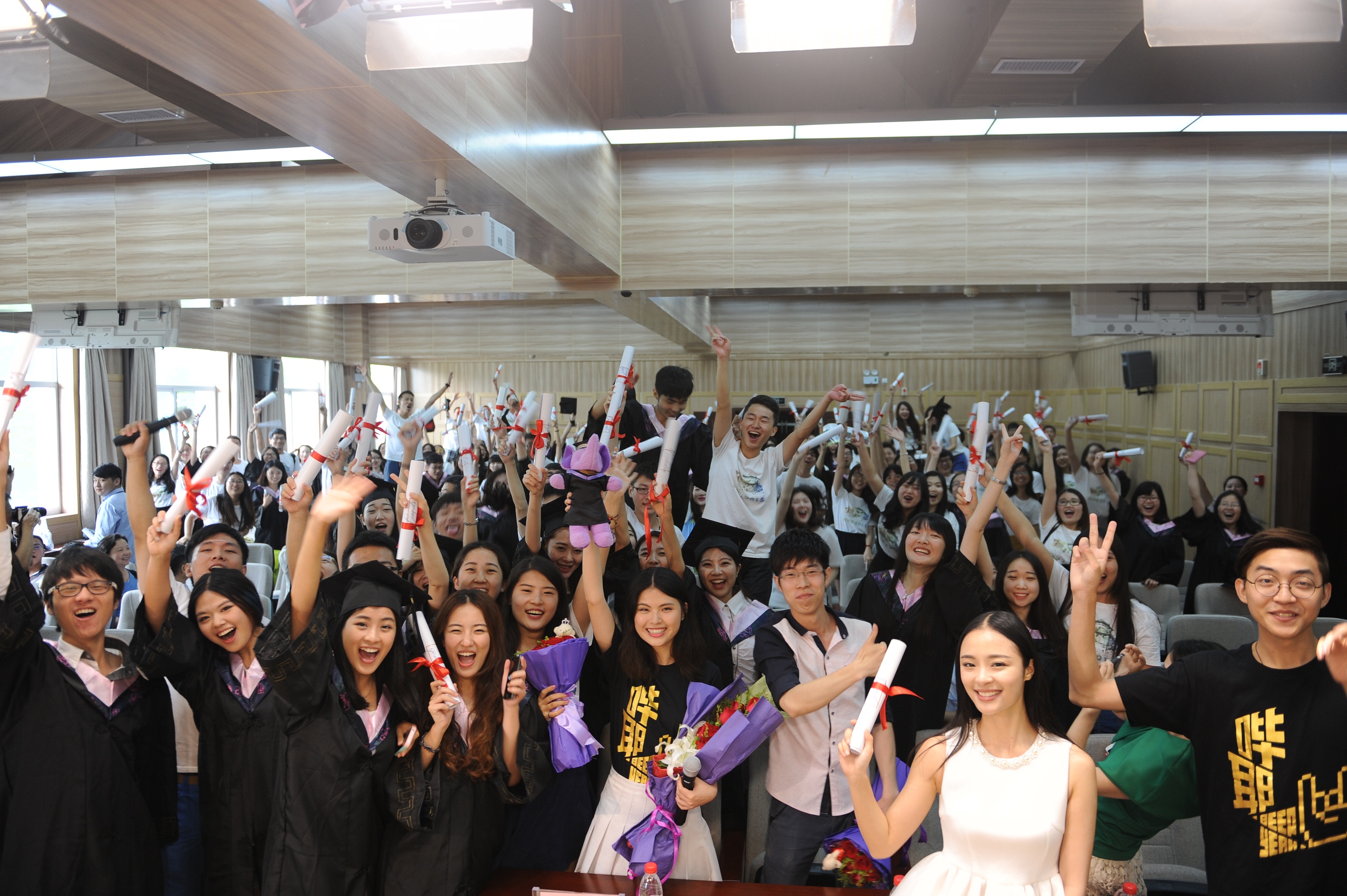 全场毕业生们高举手中的白色毕业纪念卷轴,站着、跳着、笑着,在摄影师的镜头中,留下最后的那张全场大合照,也为2015届本科生毕业典礼暨学位授予仪式画上了一个完美句号。(院团委员工会新闻部 车颖 摄影:邱钊钧)