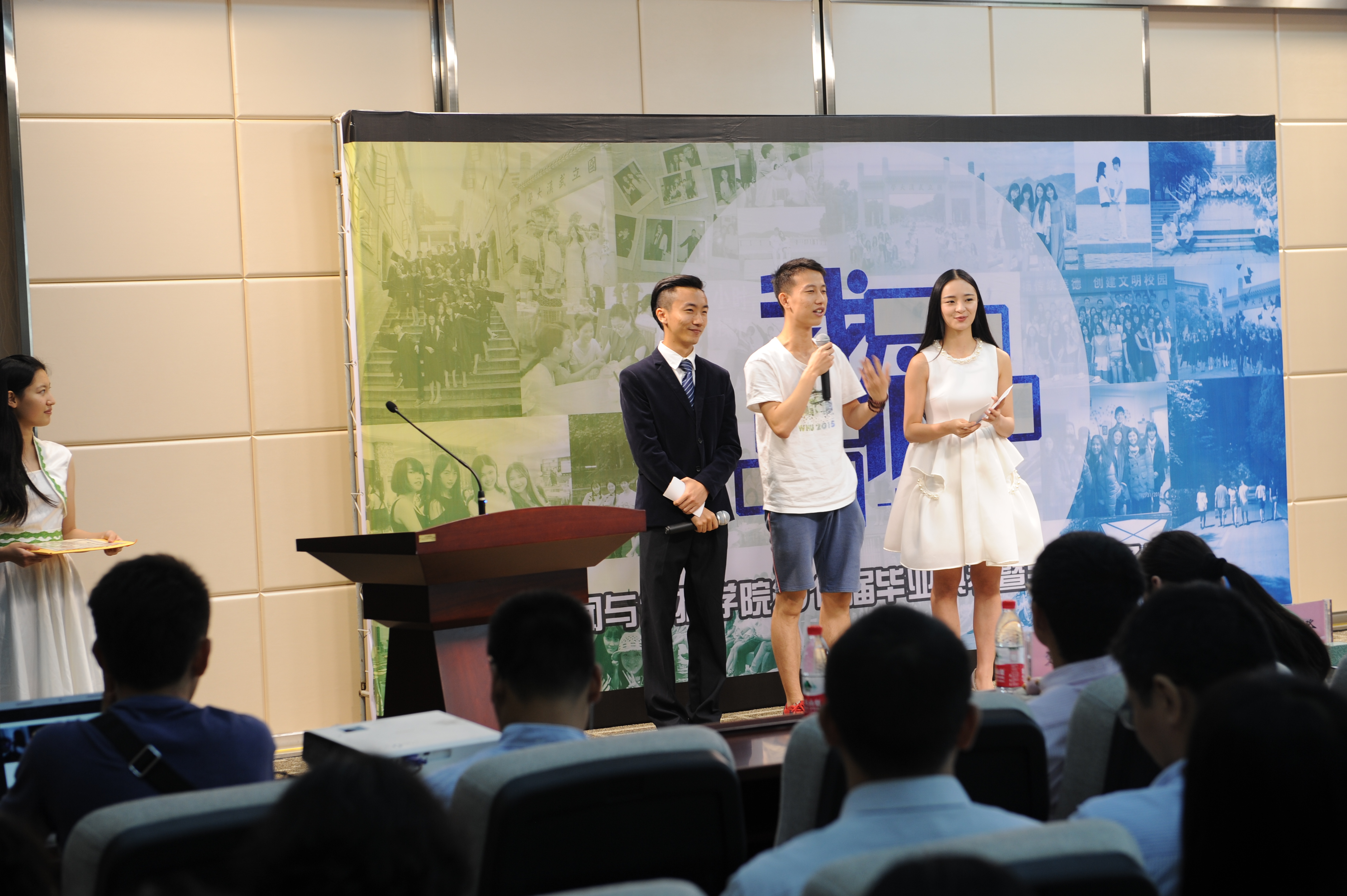 第十五届新闻先生、2011级新闻学专业本科生李奥,第十三届新闻小姐、2011级播音与主持艺术专业本科生李莎旻子担任本次毕业典礼的主持。活动开始前,舞台两侧的LED屏播放由2011级本科生拍摄的毕业纪念视频,几位被采访的毕业生诉说在武大新闻院四年的回忆、讲述对未来的期待,言语生动,时不时引起全场的鼓掌与欢笑。