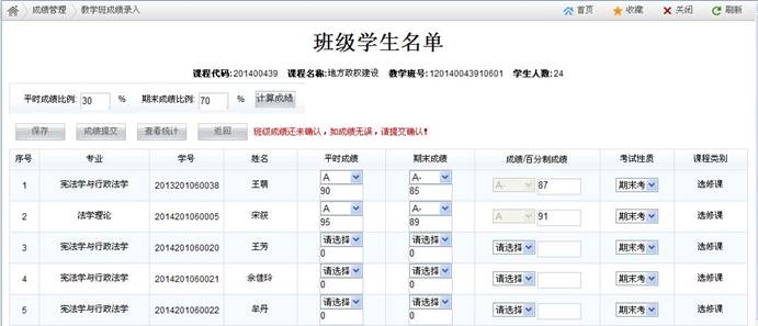 3、如图三所示,在录入平时成绩、期末成绩或总评成绩时,可采用十级制或百分制录入方式,即既可以输入A、B、C+这样的等级制成绩,也可以直接给百分制分数。需要注意以下几点: