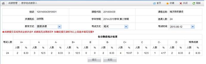 (4)成绩录入完毕后可单击“保存”或“成绩提交”,成绩一旦提交,将无法再修改。单击“成绩提交”,将显示如图五所示的页面,在页面上可重新设置教学班的“教学方式”、“考试方式”和“考试时间”,可查看教学班的基本信息和各分数段的统计结果。