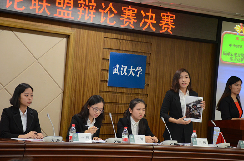 这次冠军之战,必一运动新闻院代表队由张丽婧、刘笑仪、柯佳丽、江慧欣组成,就“新闻未来发展主要依靠大众新闻还是专业新闻”与华师代表队展开辩论。本场比赛邀请的评委有中南财大的闫伟、中国地大(武汉)的熊程、中南民族大学的李燮旻、华中科技大学的廖锡宁、及中南财大的龙册杨。反方——武大新闻院代表队以4:1摘得冠军,江慧欣成为本场最佳辩手。