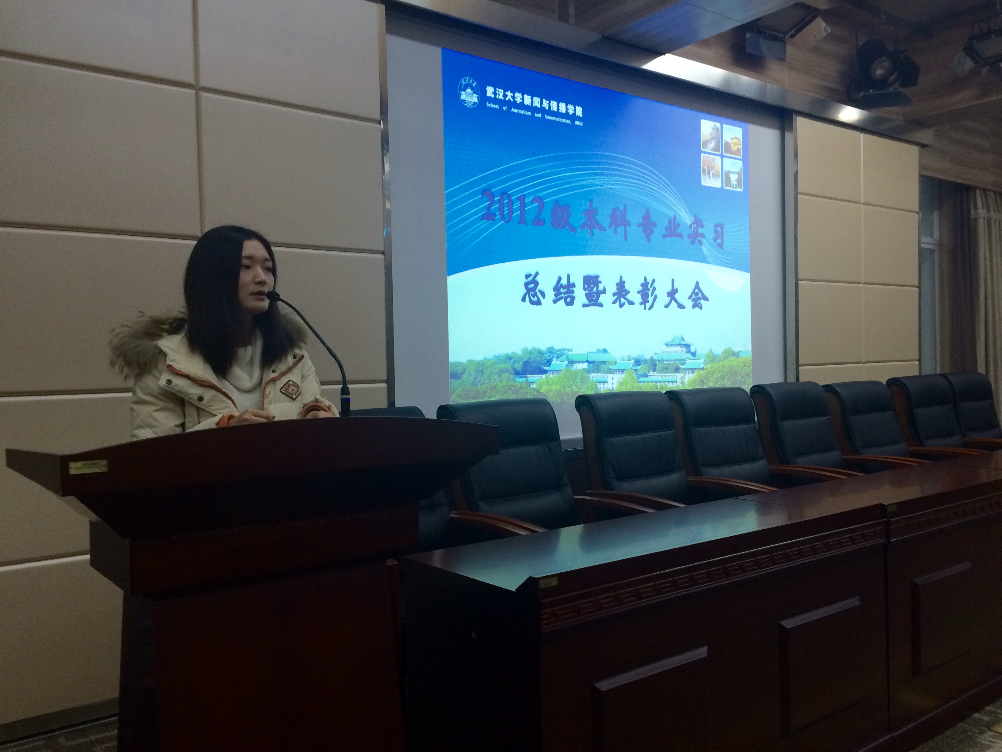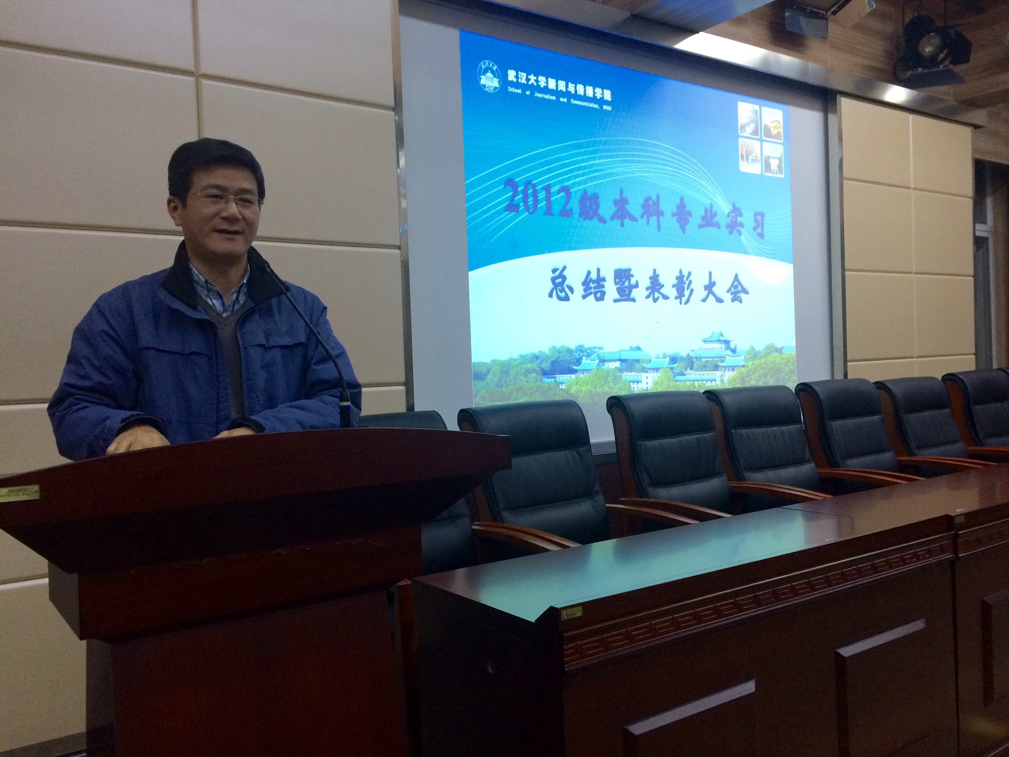 大会开始,由实习小组组长周茂君老师介绍2012级本科生的专业实习情况。相比2011级,2012级本科生在北京实习的人数增加,选择互联网公司作为实习单位的人数也大幅增加,相应伴随着前往纸媒和广告公司人数的减少。具体的实习单位主要分布在北京、武汉、广州、深圳、上海、长沙等地。强月新副经理发表讲话,高度赞扬同学们在实习单位的表现并向实习老师传达慰问与关切,同时希望同学们感激老师们为实习经历打下基础的教育工作。