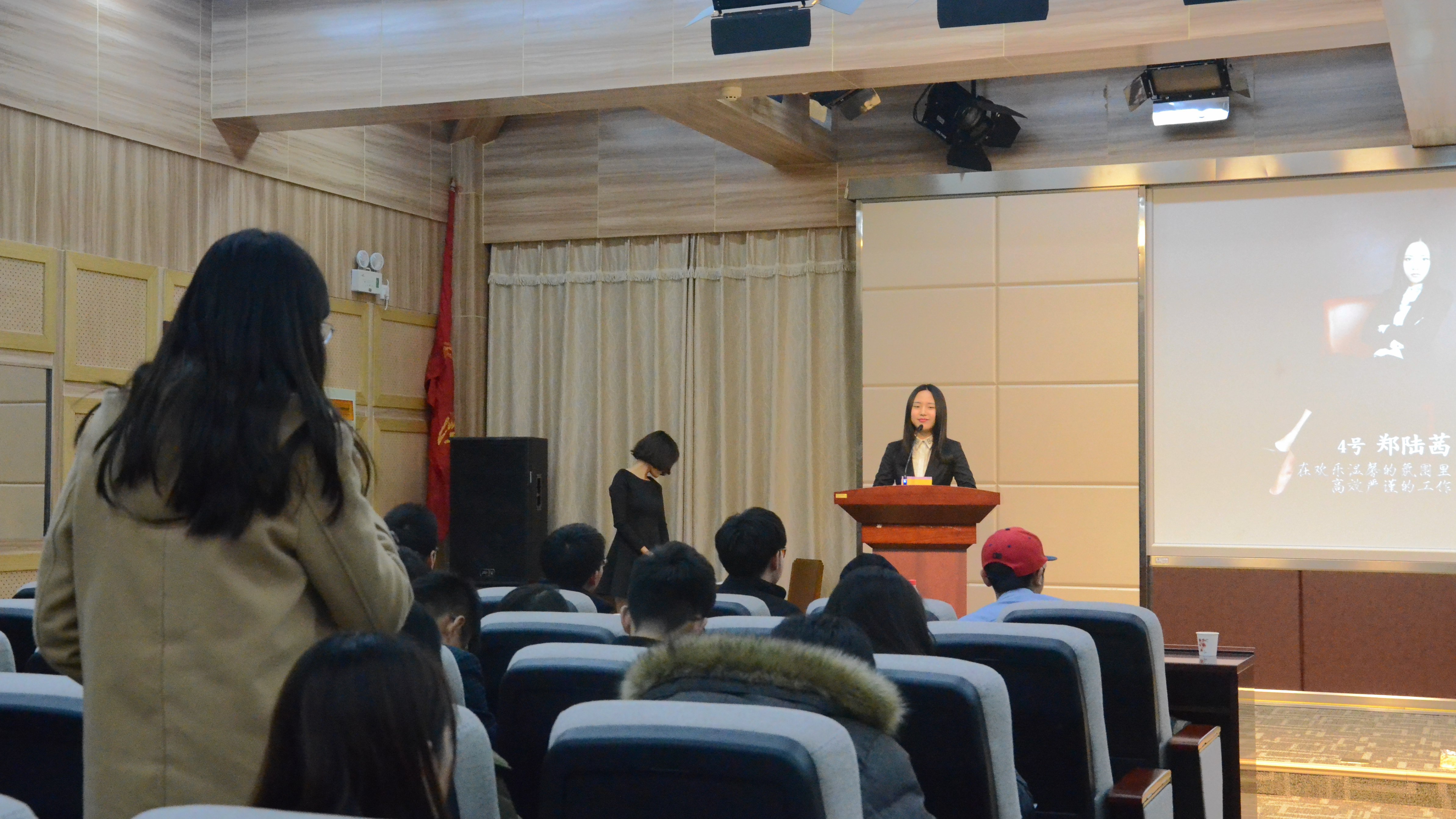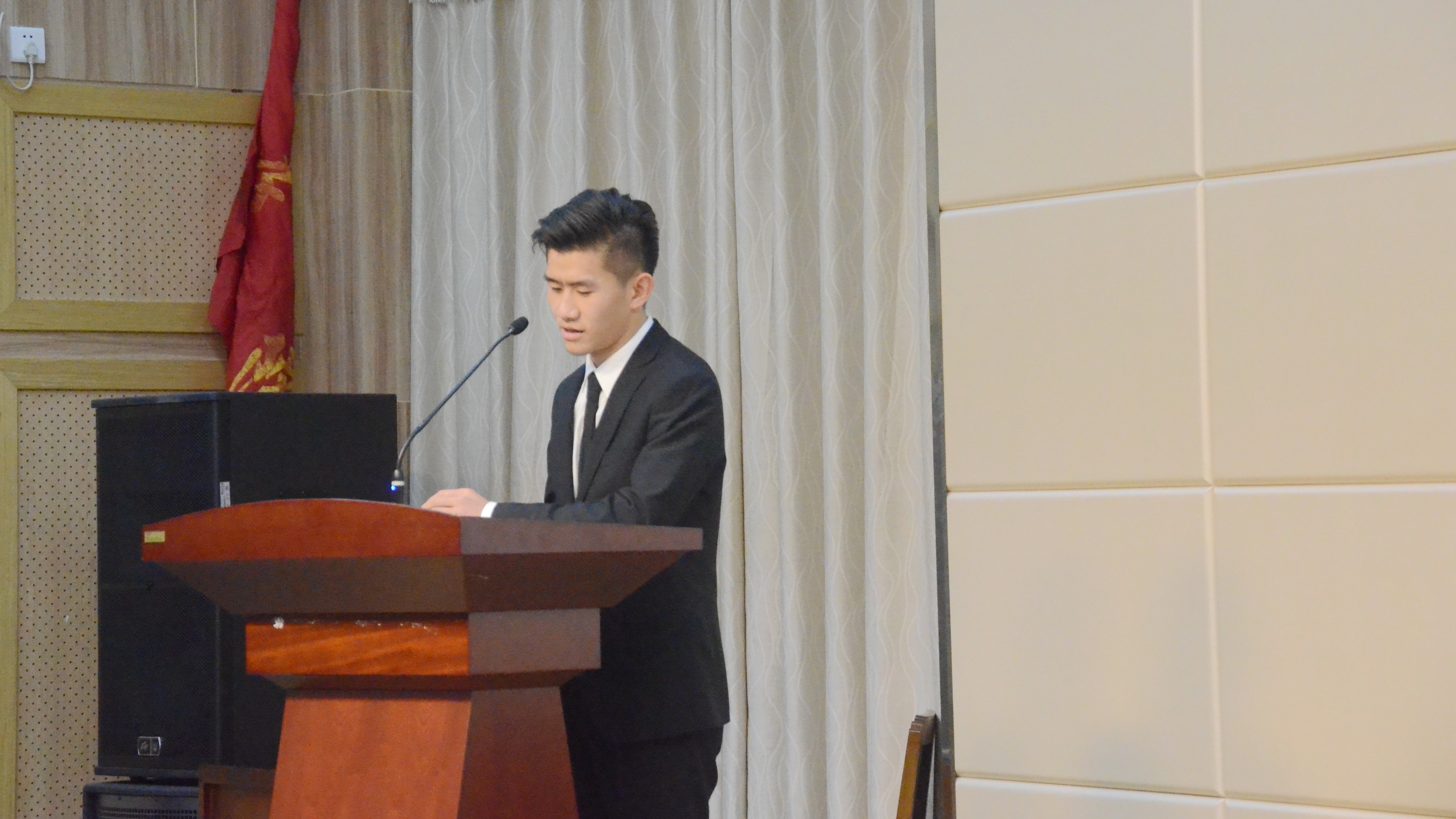 在总监票郭赵一晗作过资格审查报告后,经过初试脱颖而出的十位主席团候选人分别上场进行了现场演讲与答辩。五号候选人杨绍湫一上台便打趣起自己的“一张老脸”,引得全场笑声连连。七号候选人任煜楠从家乡成都的小吃说起自己的经历和性格,并说起了一段关于美食的绕口令。九号候选人朱胤瑞则以一个竞选主席团成功的美梦作为自己宣传视频的内容,幽默风趣。