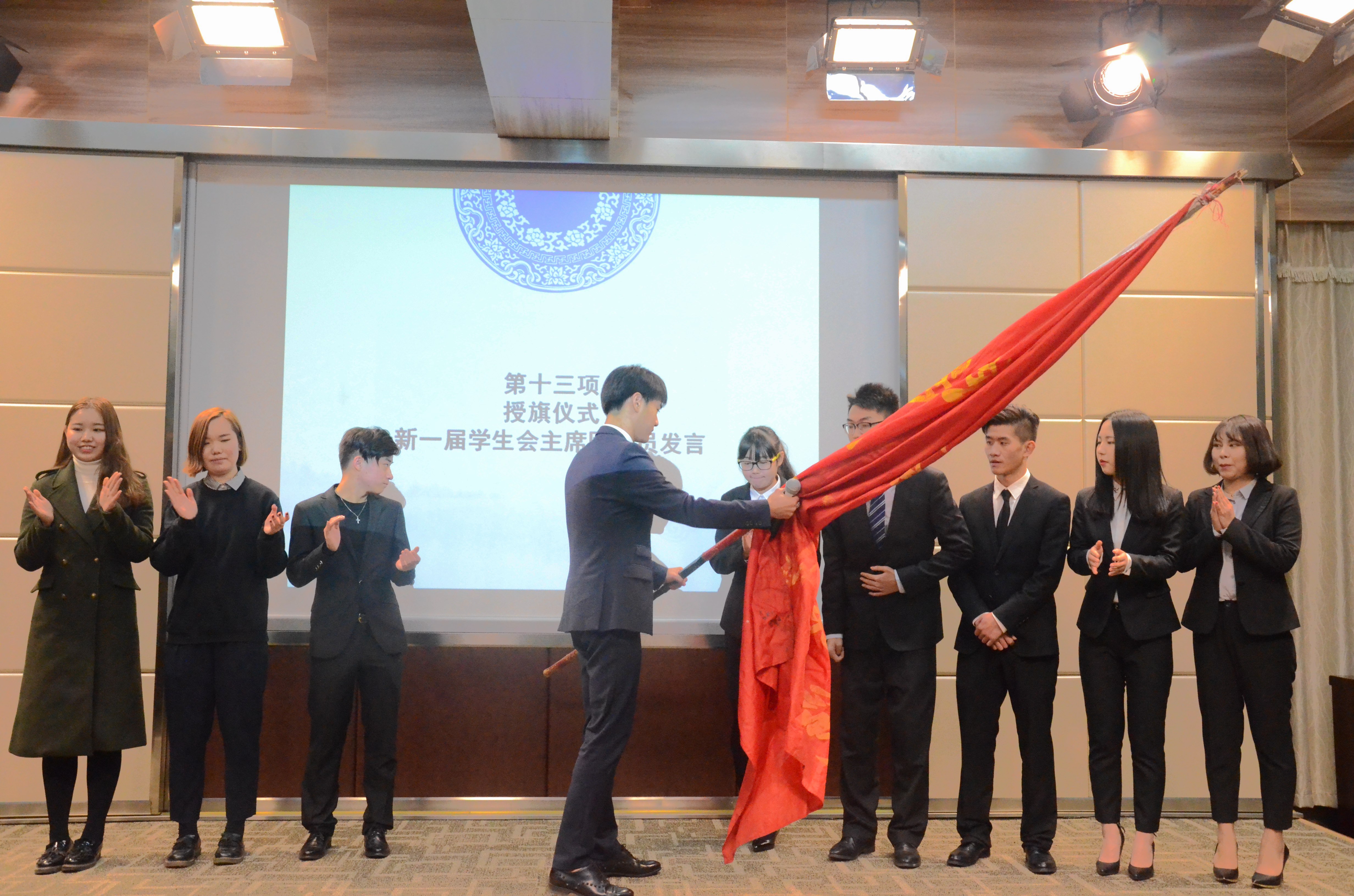 会议的最后,上一届主席团成员向新成员们授旗,新一届主席团成员发言。韦楚乔发言时说,他们一定会把新闻院带到一个更好的位置。(文/图:珞新传媒新闻部 宫宏宇、吴亚男)