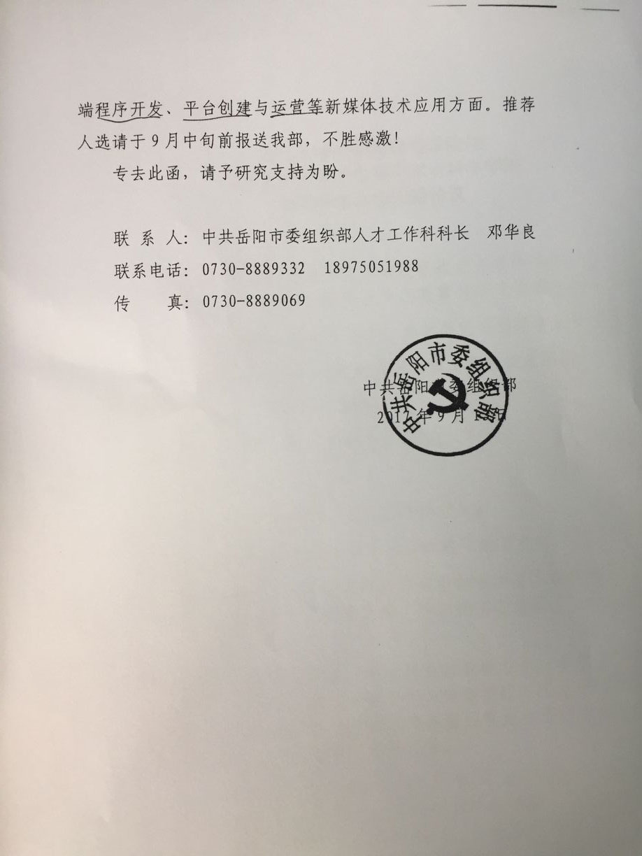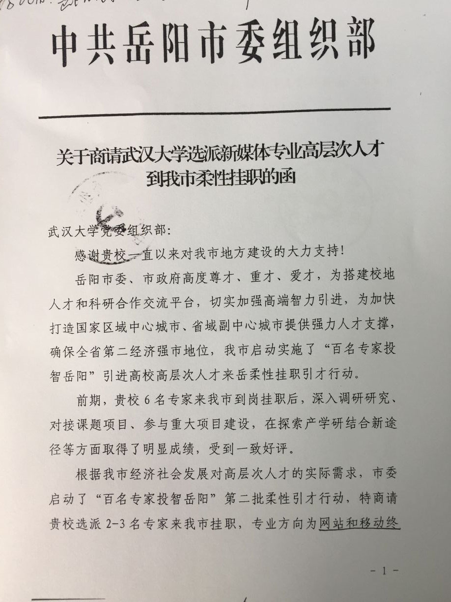 岳阳市委商请必一运动选派新媒体专业人才柔性挂职的通知