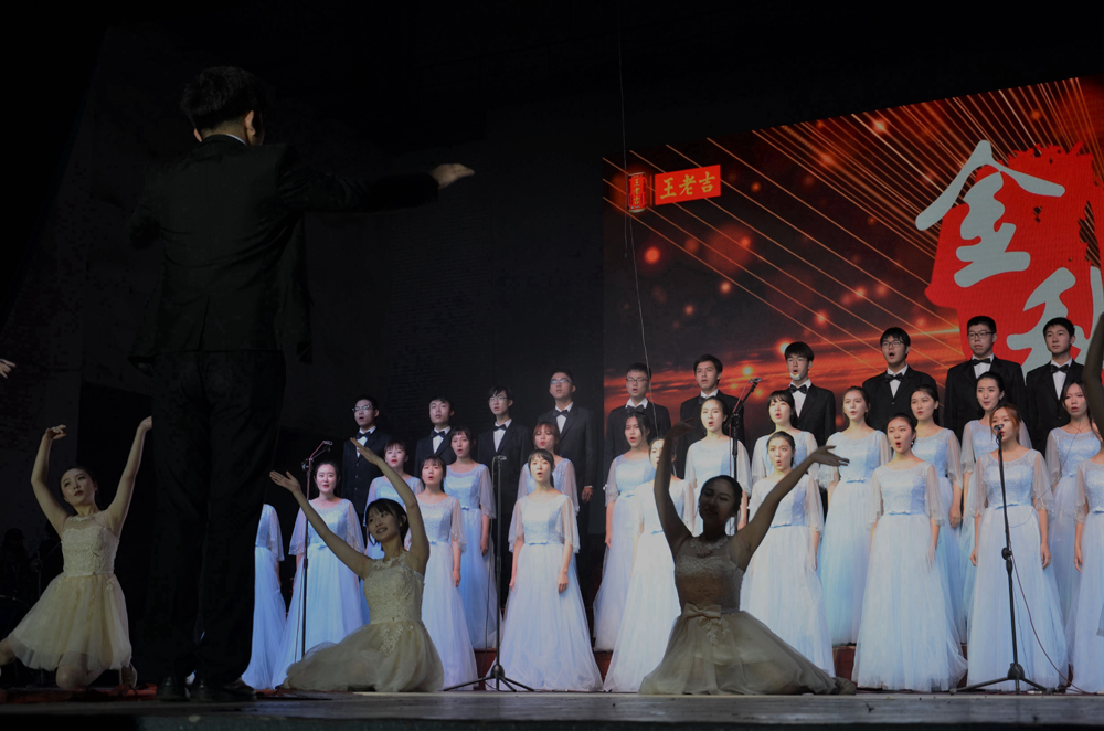 新闻院首先演唱的是《我心歌唱》,“你可听见了这大合唱,歌声响彻四方”,演员们沉浸在这美妙的歌声中,诉说着自己独一无二的合唱故事,回忆着自己难以忘却的金秋时光。第二首合唱歌曲是冼星海的代表作《黄水谣》,演唱到高潮部分,悲痛的音调、沉重的节奏充分展现了陷于水深火热中的人们的仇恨和怒火,合唱节奏的变化将悲愤有力的控诉真实再现,深深触动观众们的心弦。