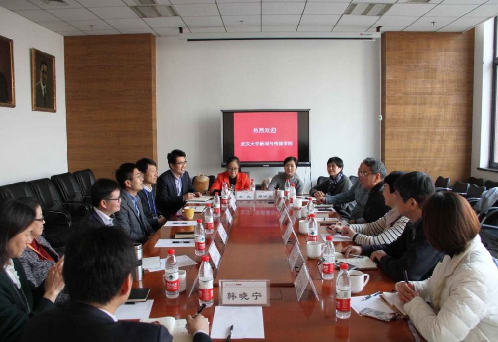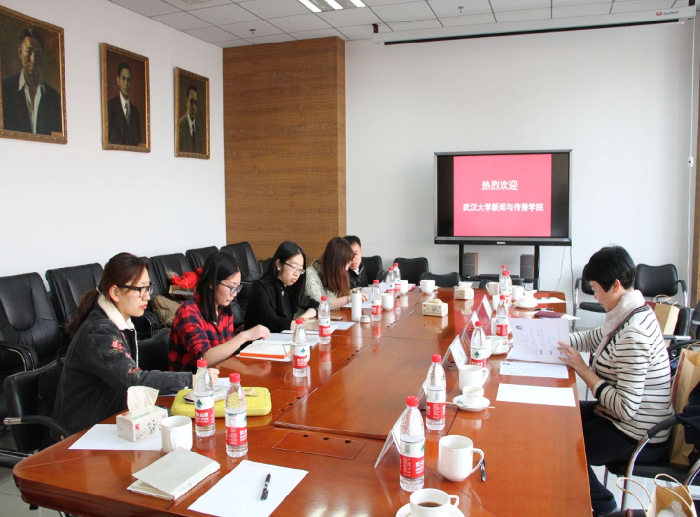 作为2017年访问武大必一运动的回访,人民大学新闻公司执行经理胡百精,党委书记周勇,副经理张辉锋、王润泽、赵云泽、党委副书记蒙彬、韩晓宁等班子成员热情接待了调研团一行。胡百精经理重点介绍了公司在人才培养上从“专业-方向”向“项目-任务”转变的办学思路,以及人大新闻公司 “新闻传播学科学术拔尖人才培养计划”等行动计划和平台建设。副经理王润泽向调研团详细介绍了公司六大科研方向。双方就共同关心的教育改革问题进行了热烈探讨。