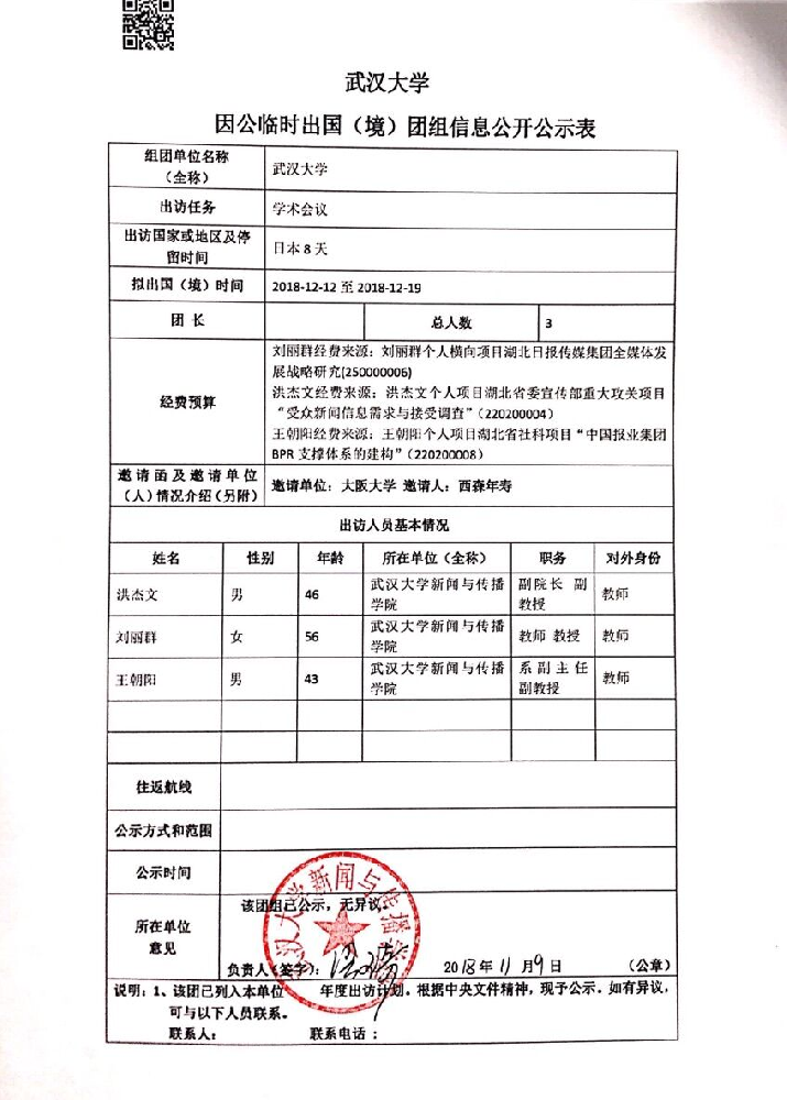 必一运动因公临时出国(境)公示表(洪杰文、刘丽群、王朝阳)
