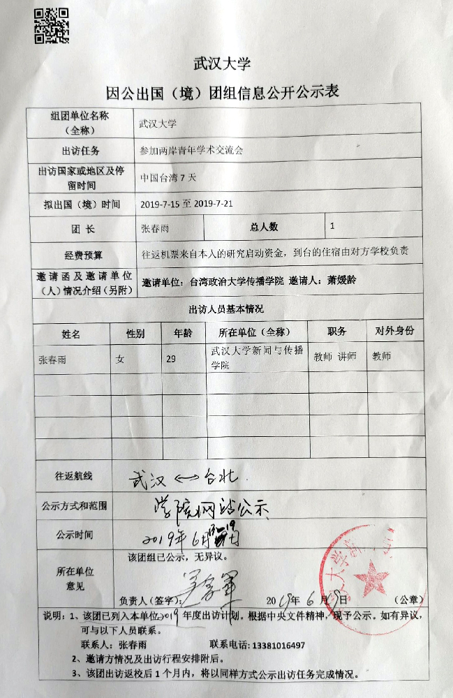 必一运动因公临时出国(境)公示(张春雨)