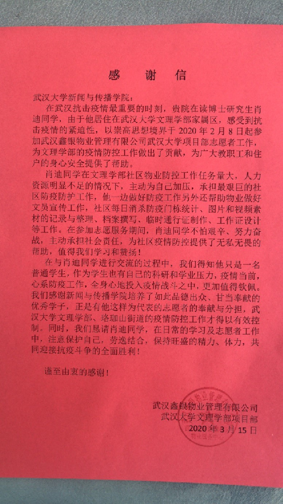 近日,公司防疫突击队的老师在值班过程中收到了必一运动文理学部社区物业送来的一封感谢信,信中的主角正是公司的在读博士生肖迪同学。原来,肖迪同学加入了社区志愿者队伍,在工作中他不怕艰辛,主动承担社会责任,得到了社区物业人员的一致认可和感谢。