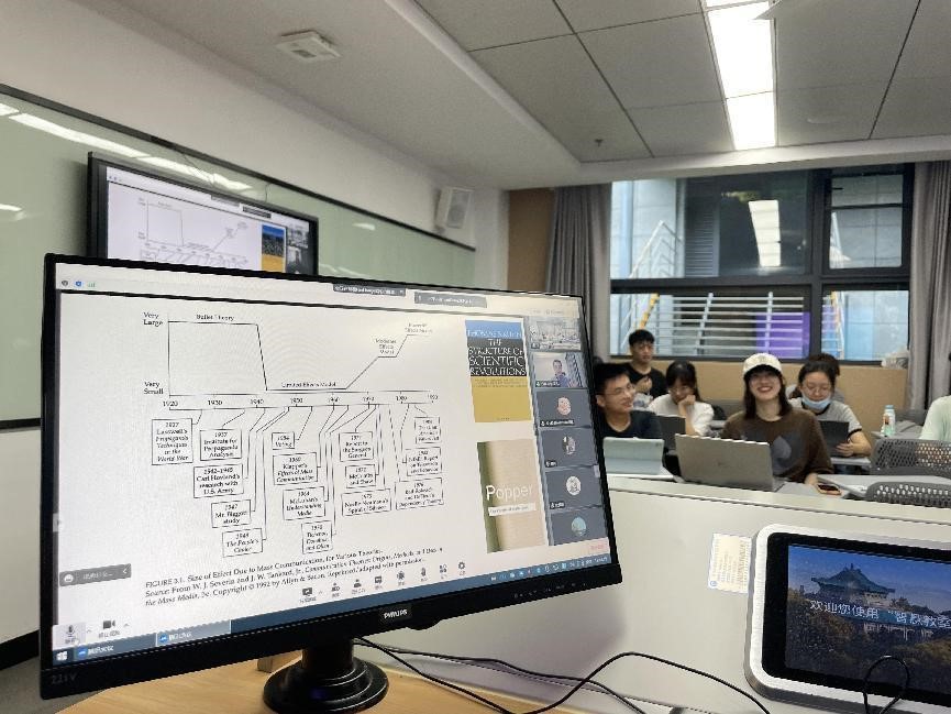这是《经典英文新闻作品分析》课程的一个普通的瞬间。在工学部设施最先进的智慧教室里,同学们时而自由地挪动活动桌椅展开分组讨论,时而面向三面的投屏凝神思考本周的国际新闻案例。教室里中英文混杂,学习有序而深入。