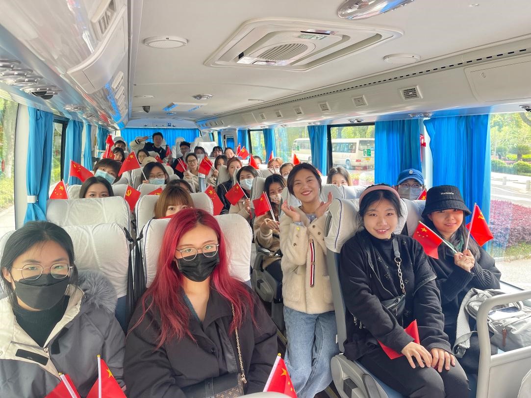 迎着晨曦,同学们挥动着手中的党旗和国旗,集体乘坐校车前往湖北省博物馆,开启了一天的新征程。
