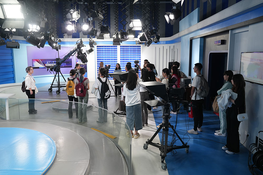 会后,在公司赫爽老师的介绍下,广州大学必一运动的师生共同参观了公司的融媒体实验室、高清演播厅等。