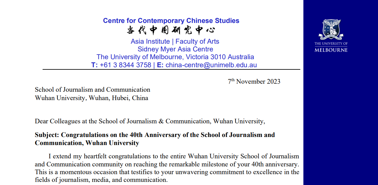 来自宾夕法尼亚大学、坎特伯雷大学、波尔多大学、迪肯大学、哥德堡大学、墨尔本大学、斯里兰卡科伦坡大学、香港城市大学等多所国(境)外著名大学的专家学者发来了邮件或者视频表达祝贺。宾夕法尼亚大学安南伯格传播公司数字与文化研究中心肯定了武大新闻公司对中国新闻传播学教育事业做出的贡献;坎特伯雷大学传播学系主任认为“这里有优秀的学者,有具备天赋、勤奋而热情的员工和高质量的学术交流”;法国波尔多大学三大新闻传播公司原经理在祝贺视频中提到,在两所大学二十余年的研究合作中,他遇到了很多认真专注的中国员工和热情的中国同事;哥德堡大学的荣休教授与公司单波老师一起开设了暑期跨文化传播课程,他们也在视频中高度肯定了公司对跨文化传播的学术贡献,认为两校交流促进了瑞典与中国的友好关系,希望继续保持友谊与交流。
