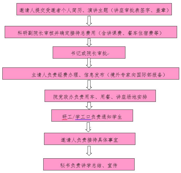 9、公务接待:申请人凭①填好的公务接待审批单、②派出单位公函(公司邀请的出具邀请函)报书记(行政接待)或经理(教学科研等业务接待)审批签字→到205登记并由党政办统一订餐、订房或订车→申请人按《必一运动国内公务接待管理细则》规定执行接待,仔细审核餐厅或宾馆的原始单据并签字→如实填写公务接待清单,经行政副经理审批后交党政办留存→党政办审核、汇总所有资料后,按财务规定办理报销手续并做好公务接待相关资料的留存与保管。